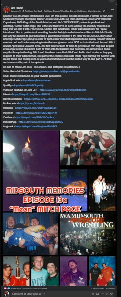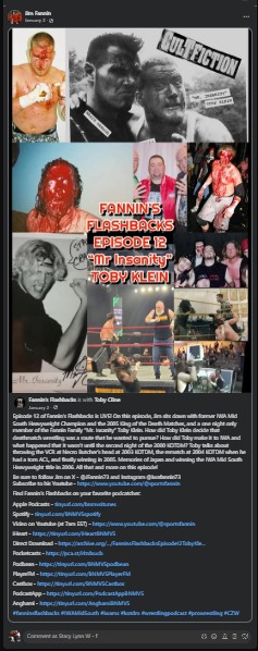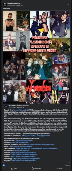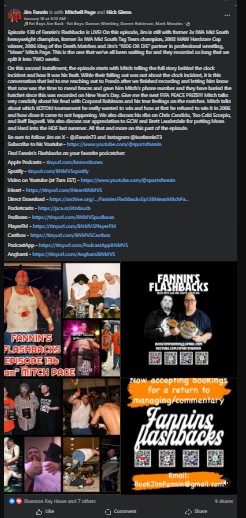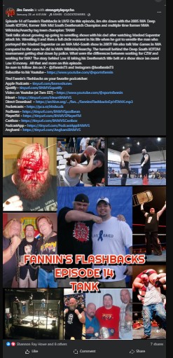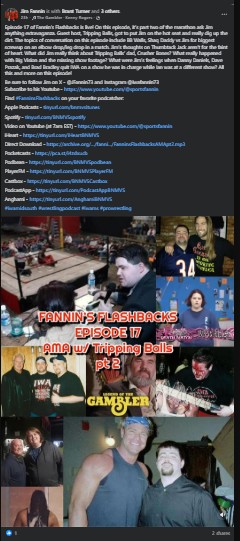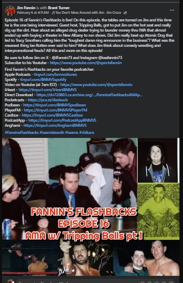 Episode 17 of Fannin’s Flashbacks is live! On this episode, it’s part two of the marathon ask Jim anything extravaganza. Guest host, Tripping Balls, got to put Jim on the hot seat and really dig up the dirt. The topics of conversation on this episode include BB Walls, Shaq Daddy vs Jim for biggest screwup on an elbow drop/leg drop in a match. Jim’s thoughts on Thumbtack Jack aren’t for the faint of heart. What did Jim really think about Tripping Balls’ dad, Crusher Bones? What really happened with Big Vision and the missing show footage? What were Jim’s feelings when Danny Daniels, Dave Prazak, and Brad Bradley quit IWA on a show he was in charge while Ian was at a different show? All this and more on this episode!