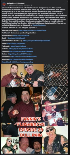 Episode 23 of Fannin’s Flashbacks is live! On this episode, Jim is joined by one of the baddest motherfuckers on the planet, the leader of the BMFers, big, bad, BULL Motherf*ckin’ PAIN! Bull talks about growing up as an AWA fan in Wisconsin and then the difficulty in trying to break into the business in an era where everything was highly guarded and closed off to newcomers. The list of amazing talent that Bull worked with in beginning of his career is the who’s who of 1980s professional wrestling. Brody, Slaughter, Bockwinkel, Rockers, Freebirds, Hennig, Hart Foundation, Road Warriors, Haku, British Bulldogs, and Rougeaus. What were young Rick Steiner, Nailz, Brad Rheingans, and Tom Zenk like? What was it like working a show in a women’s prison? And yes we even talk a little bit about IWA and working Tracy Smothers, Sal Sincere, Paul Diamond, Buddy Landel, Ted Petty, and yes Ian Rotten. All that and more on this episode of #FanninsFlashbacks.
