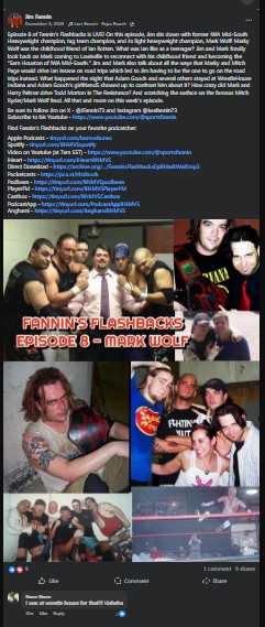 Episode 8 of Fannin’s Flashbacks is LIVE! On this episode, Jim sits down with former IWA Mid-South Heavyweight champion, tag team champion, and 4x light heavyweight champion, Mark Wolf! Marky Wolf was the childhood friend of Ian Rotten. What was Ian like as a teenager? Jim and Mark fondly look back on Mark coming to Louisville to reconnect with his childhood friend and becoming the “Sam Houston of IWA Mid-South.” Jim and Mark also talk about all the ways that Marky and Mitch Page would drive Ian insane on road trips which led to Jim having to be the one to go on the road trips instead. What happened the night that Adam Gooch and several others stayed at WrestleHouse Indiana and Adam Gooch’s girlfriends showed up to confront him about it? How crazy did Mark and Harry Palmer drive Todd Morton in The Resistance? And scratching the surface on the famous Mitch Ryder/Mark Wolf feud. All that and more on this week’s episode.