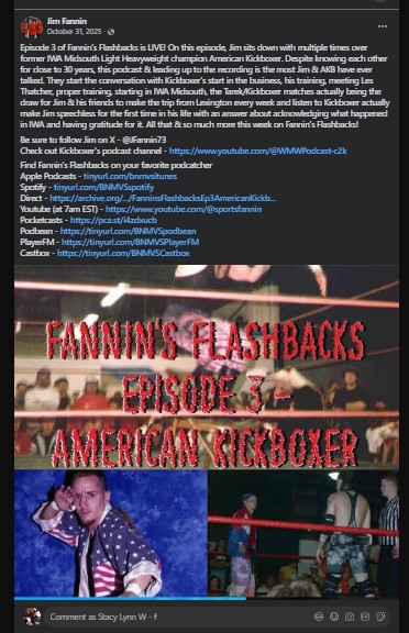 Episode 4 of Fannin’s Flashbacks is LIVE! On this episode, Jim sits down with the man truly responsible for getting him into the business, Les Johns. College friends that bonded over their love of wrestling, they talk about how Les calling the IWA hotline and leaving a critique of the show ended up with Ian Rotten calling at 3 am to yell at him about the critique. That phone call grew into Les Johns, Ben Rich, and Jim becoming involved in IWA Mid South and bringing shows to Lexington. The release date of this episode (11/7/25) is the 28th anniversary of that debut show in Lexington (11/7/97). So the day before his 49th birthday, Jim celebrates the 28th anniversary of entering the wrestling business. Les and Jim discuss going to ECW fan cons, the 1997 Final Four to watch their Alma mater UK, Starrcade 1995 & 1996, and the 1996 King of the Ring. Where was Jim when Stone Cold Steve Austin was born and debuted the catchphrase Austin 3:16? You have to listen to find out! All that & so much more this week on Fannin’s Flashbacks!